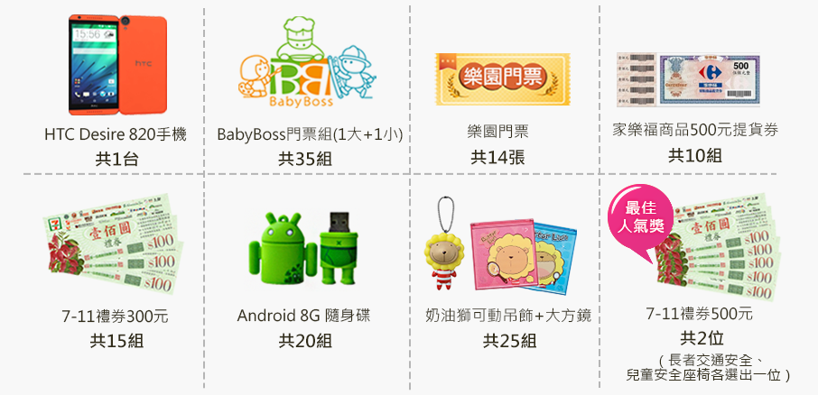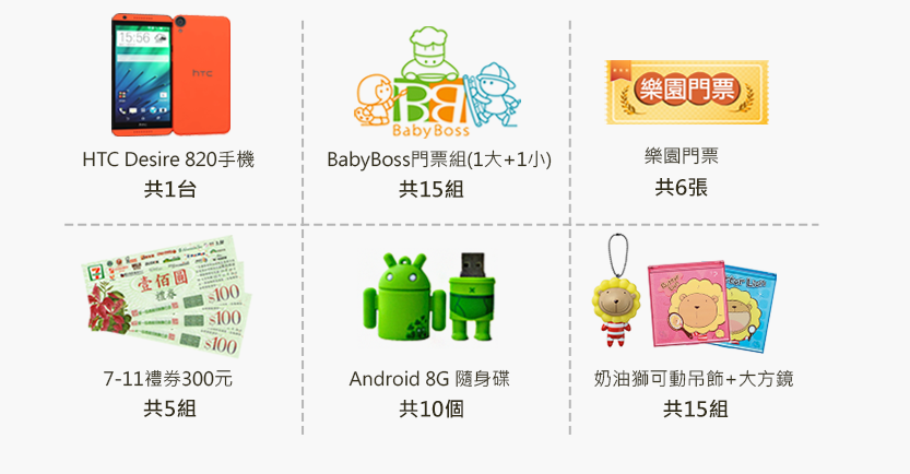 除HTC Desire 820手機外,還有BabyBoss門票組、樂園門票、7-11禮券等好禮等你來拿喔!